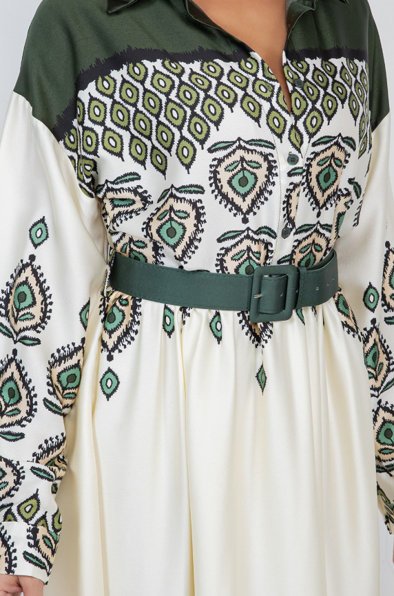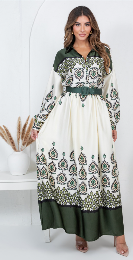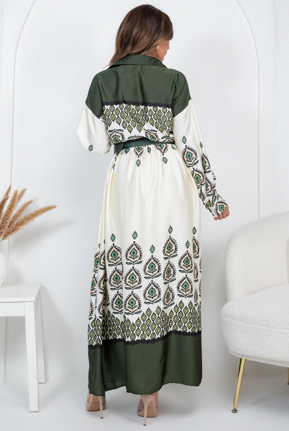 Make a bold and elegant statement with this Contemporary Graphic Print Maxi Dress, designed to blend modern flair with timeless sophistication. Crafted from luxurious satin fabric, this dress features a classic collar, button-down front, and a belted waist that flatters every figure.