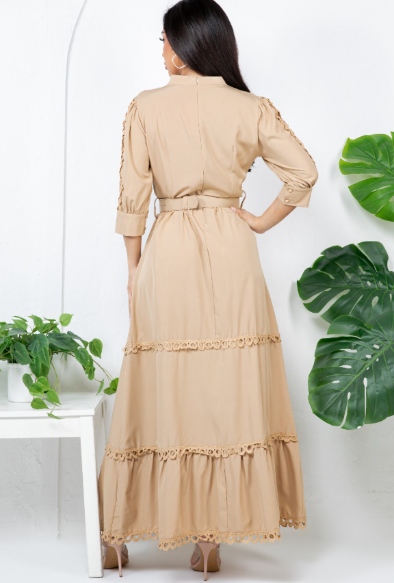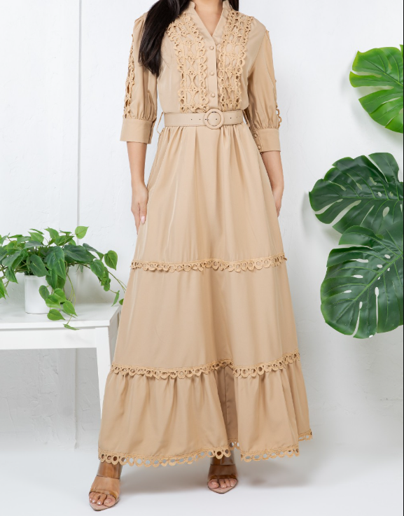 Turn heads with this Elegant Solid Maxi Dress, designed for the modern woman who loves timeless style and sophistication. Featuring a crochet trim, a flattering V-neckline, and a belted waist, this dress combines classic charm with contemporary elegance.