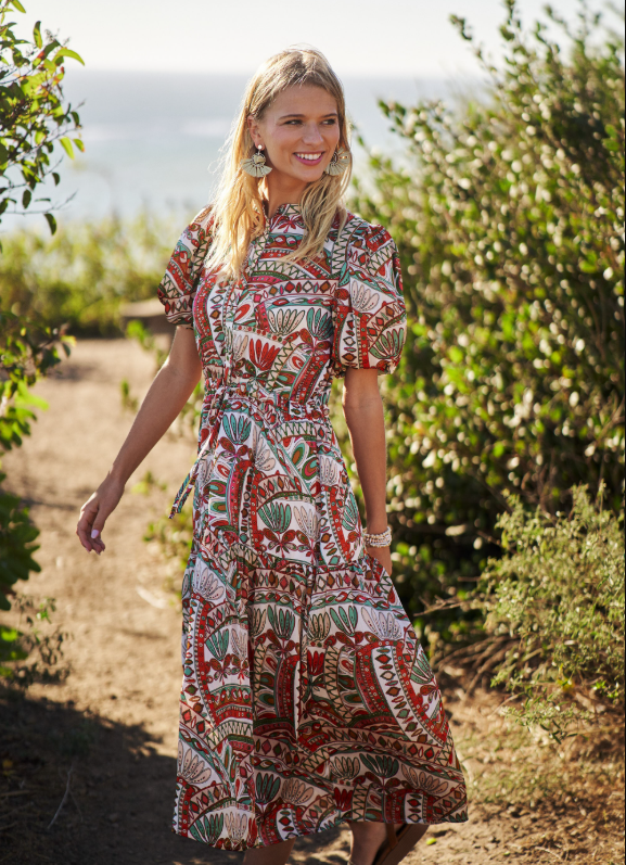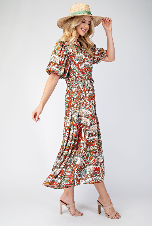 The bubble sleeves add a playful touch, while the midi length offers elegant coverage. Crafted from 100% polyester, it’s lightweight, comfortable, and ideal for year-round wear.