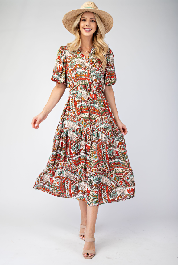 Bring a touch of romance and charm to your wardrobe with this Short Bubble Sleeve Tiered Midi Dress. Designed with soft, flowing layers and a flattering waist tie, this dress creates a feminine silhouette that’s perfect for any occasion.
